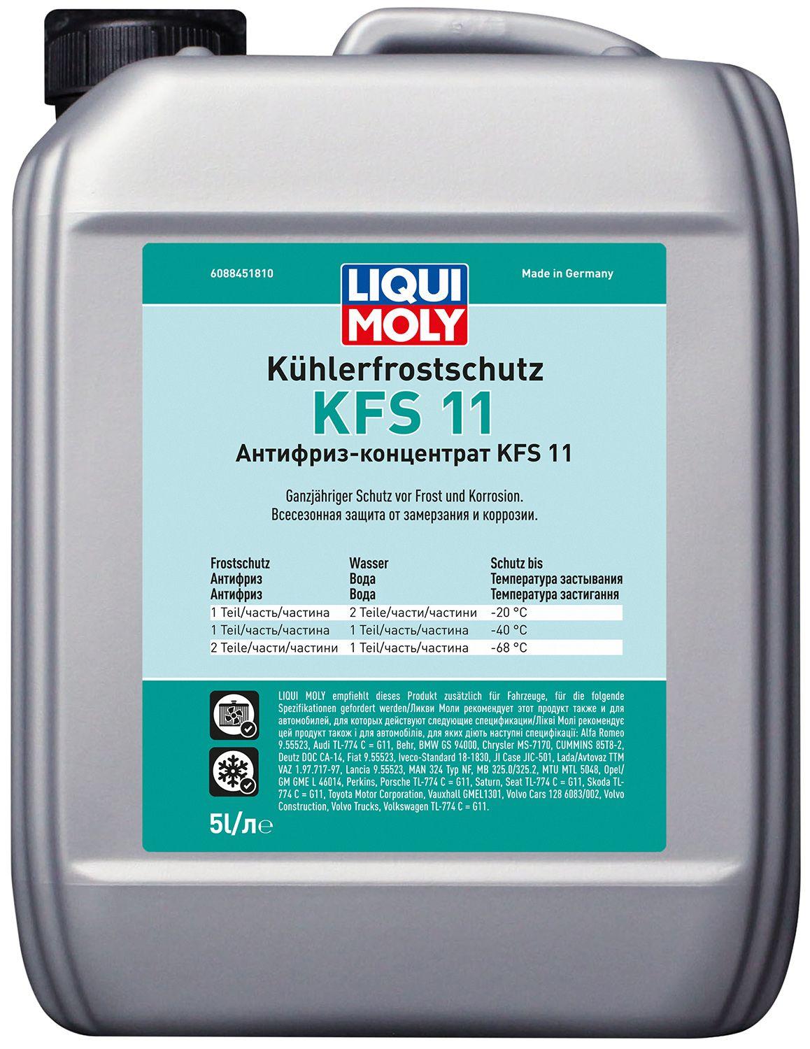 Liqui Moly Kuhlerfrostschutz KFS 11 - антифриз на основе этиленгликоля и присадок гибридного класса первого поколения. Обеспечивает отличную защиту от замерзания, ржавчины, а также от перегрева. При смешивании с водой обеспечивает надежную защиту системы охлаждения автомобиля при круглогодичном его применении. Образует приповерхностный слой, эффективно защищающий от коррозии. Рекомендуется на интервал замены от двух лет.