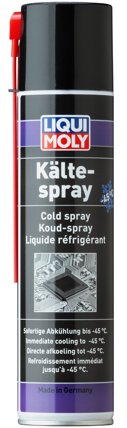Kälte-Spray – аэрозоль специально разработан для подгонки шаровых подшипников, валов и поршней. Его можно применять для поиска дефектов в электросхемах , а также для простой и скорой проверки функциональности температурных датчиков. Liqui Moly Kälte-Spray может также использоваться для охлаждения горячих предметов и в медицине для предварительной подготовки проб перед проведением микроскопических исследований.